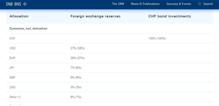 根据瑞士央行(瑞士国家银行)本周发布的统计数据,截至2025年6月底,瑞士的外汇储备总额超过1万亿美元,其中美元占37%,较一季度回落2个百分点,欧元占39%,环比上升2个百分点。